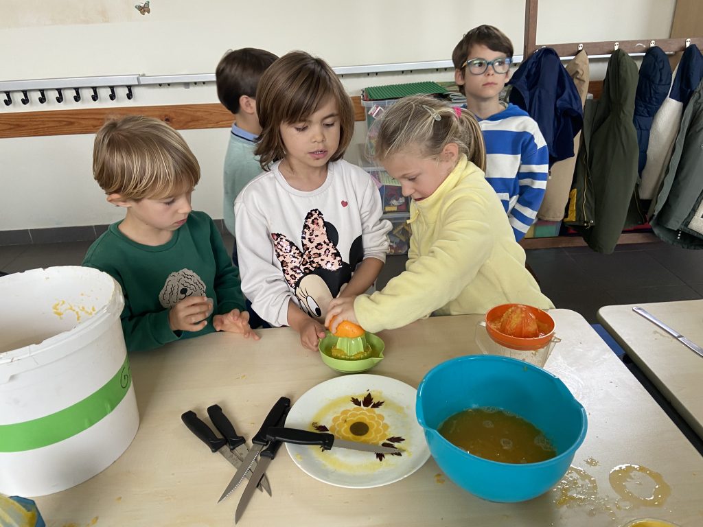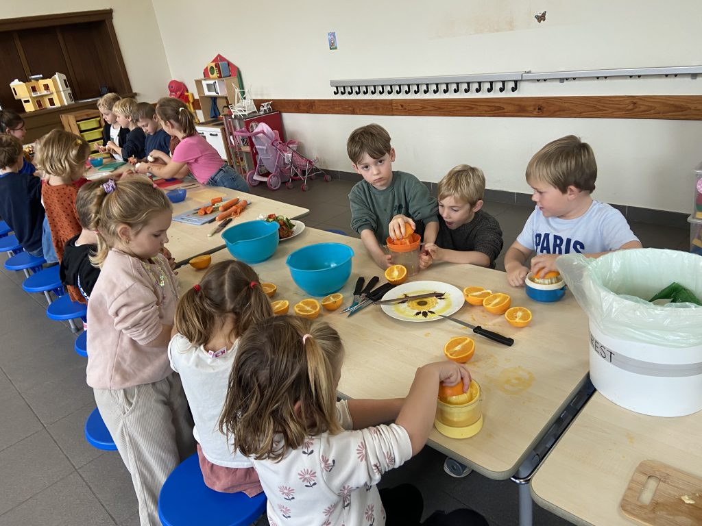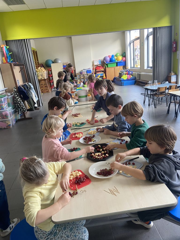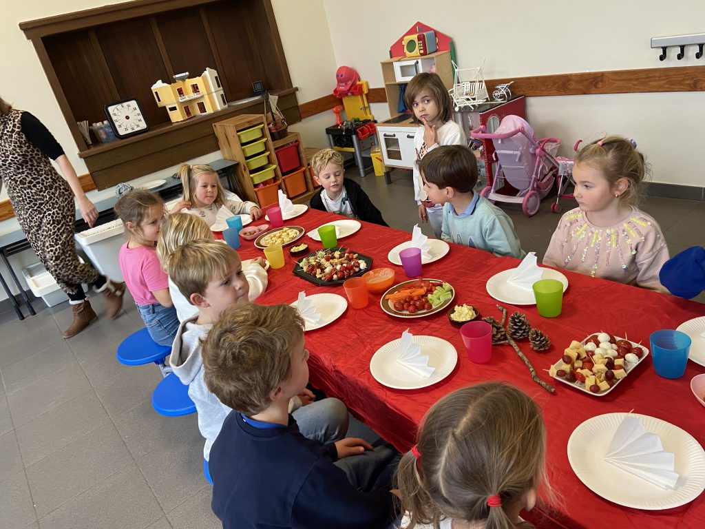 De vlinders en het eerste leerjaar staken hun handen uit de mouwen om een heerlijk (en gezond!) feestmaal te bereiden. Ze bereidden een hele resem aan hapjes en toverden vruchten om in een heerlijke smoothie! De gezellige en rijk gevulde feesttafel nodigde uit om samen te genieten van al dat lekkers! Een dikke pluim voor